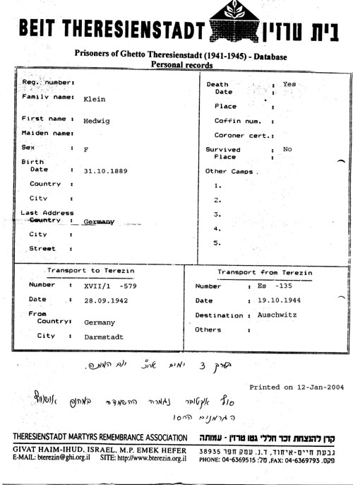 Die Familie Klein aus Mainz wurde während des Nazi-Regimes in die Stadt Darmstadt deportiert. Von dort wurde die Familie in „Transport Nummer XVII / I 578“ am 28.09.1942 ins Tereizinstadt Konzentrationslager in die Tschechoslowakei geschickt. Am 19.10.1944 wurde die Familie Klein in Transport Nummer 134 Es nach Auschwitz geschickt und wurde dort nahe dem Kriegsende hingerichtet.