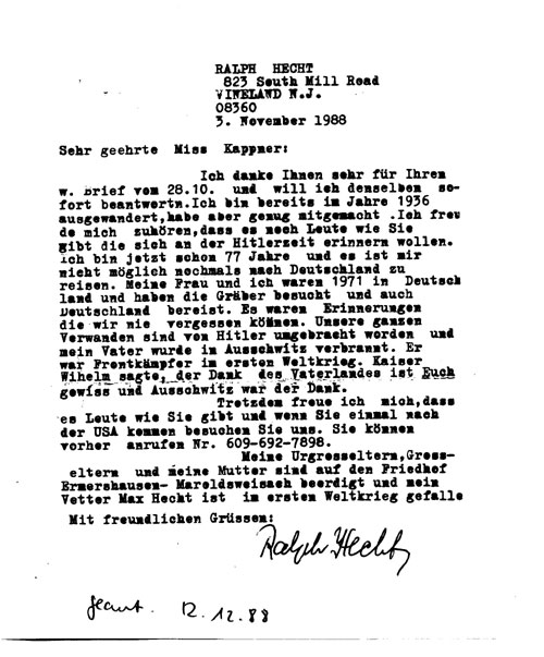 „HECHT- … Der Name meines Vaters war Rudolf HECHT. Mein Großvater hieß Max HECHT. Sie kamen aus einer kleinen Stadt namens Maroldsweisach, in der Nähe von Bamberg. Jede Hilfe wäre sehr geschätzt: [email protected], 17. Februar 1998“