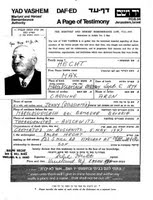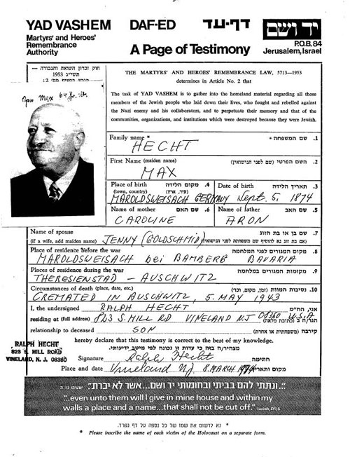 von Rudolf’s Vater, Max Hecht, in Auschwitz (auf dem Foto das Originaldokument vom 08.03.1974 von Rudolf Hecht zusammengestellt als „Seite des Zeugnisses“ (Daf-ad). Das Dokument wird in den Archiven der Gedenkstätte Yad Vashem gespeichert (The Holocaust Martyrs‘ and Heroes‘ Remembrance Authority). Weitere detailliertere „Daf-ad“ Dokumente wurden ein paar Jahre spatter von seinem Enkel geschrieben.